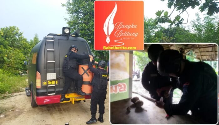 Tim Jibom Gegana Satuan Brimob Polda Kep. Babel melakukan Proses pendisposalan berlangsung aman dan terkendali dilokasi yang telah ditentukan dengan jarak lokasi -+1.000 meter (1 KM) dari permukiman warga setempat.